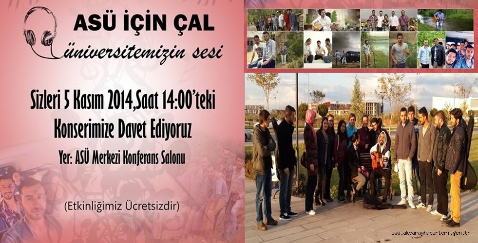 Aksaray Üniversitesi '' ASÜ İÇİN ÇAL '' Grubu Aksaraylılara Ücretsiz Konser veriyor. 05-11-2014 Çarşamba günü Saat : 14:00 daki Konser Aksaray Üniversitesi Merkezi Konferans Salonunda..