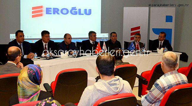 Aksaray Çalışma ve İş Kurumu İl Müdürü Mahmut AKKUŞ ise Çalışma Hayatında Milli Seferberlik programı ile işverenlerimizin ve işçilerimizin istihdam alanlarındaki sorunları paylaşabilmek ve onları minimize edebilmek hem yatırımcılarımızın, girişimcilerimizin motivasyonunu ve öz güvenini arttırabilmek sıkıntılara yerinde çözüm bulabilmek için bir aradayız Eroğlu firması İlimiz ve Ülkemiz açısından önemli potansiyele sahip istihdam üreten katma değer üreten köklü bir firmadır. Bugün Aksaray Çalışma ve İş Kurumu İl Müdürlüğü olarak 108 kişiyi İşbaşı Eğitim Programı kapsamında işe başlatılmıştır. Bu mutluluk bakanlık teşkilatımızın üst düzey yönetimi ile birlikte işveren ve işçilerimizle beraber paylaşıyoruz.