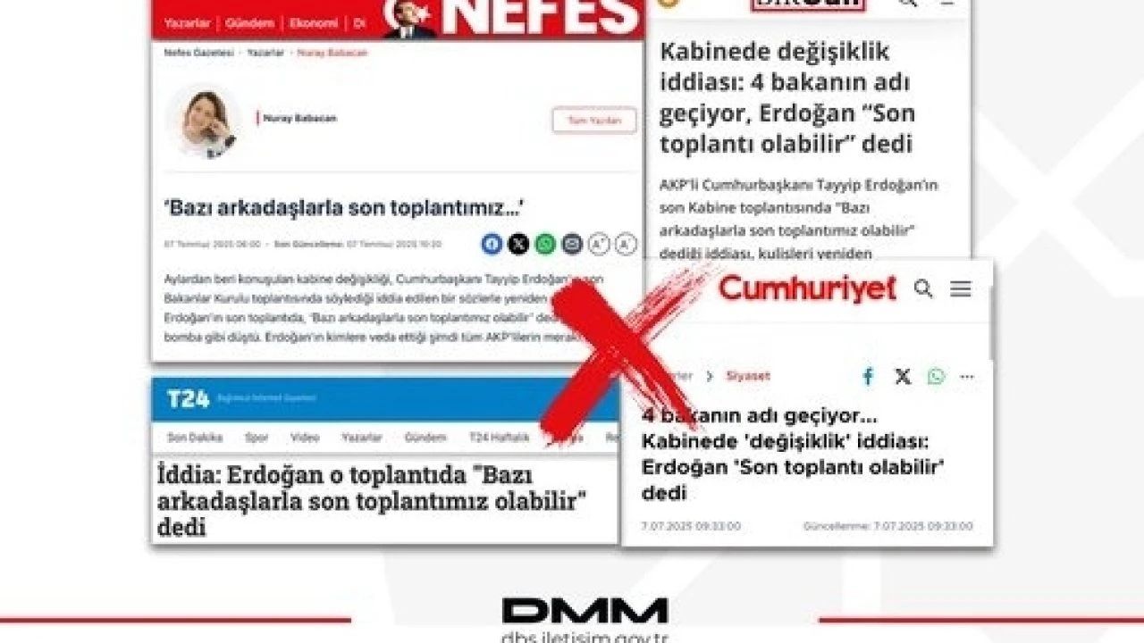 ANKARA -“Dezenformasyonla Mücadele Merkezi, bazı basın organları ve sosyal medyada yer alan, “Cumhurbaşkanı Recep Tayyip Erdoğan’ın son Kabine toplantısında ‘Bazı arkadaşlarla son toplantımız olabilir’ dediği” yönündeki iddiaların gerçeği yansıtmadığını duyurdu.