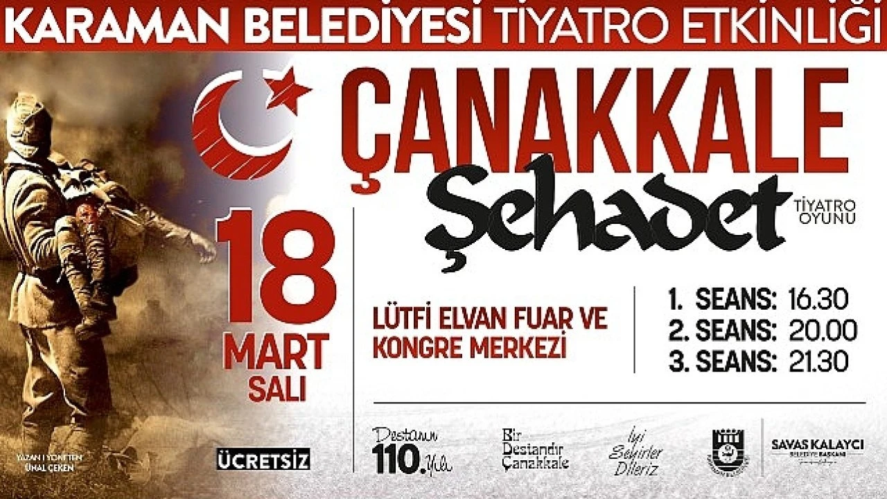 18 Mart Çanakkale Zaferi'nin 110 yılı münasebetiyle Karaman Belediyesi tarafından ücretsiz tiyatro etkinliği düzenleniyor. Karaman Belediyesi, kültür-sanat etkinlikleri kapsamında bir tiyatro gösterisini daha Karamanlılarla buluşturuyor. 18 Mart Çanakkale Zaferi'nin 110. yılı ve Şehitleri Anma Günü nedeniyle, Ünal Çeken'in yazıp yönettiği "Çanakkale Şahaadet" isimli tiyatro oyunu, 18 Mart Salı günü Lütfi Elvan Fuar ve Kongre Merkezi'nde sahnelenecek. 16.30, 20 ve 21.3 aralıklarla üç seans halinde sergilenen tiyatroya tüm halkımız davet edildi.