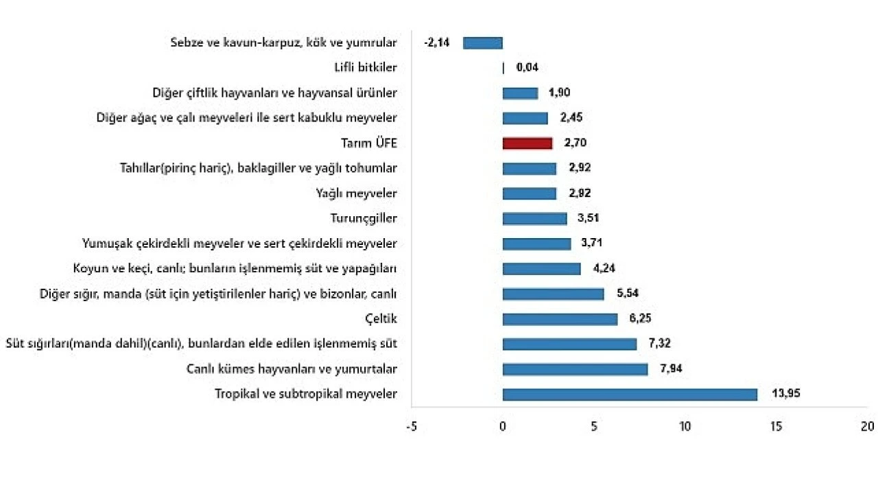 Tarım Ürünleri Üretici Fiyat Endeksi, Şubat 2025 Tarım ürünleri üretici fiyat endeksi (Tarım-ÜFE) yıllık %29,89 arttı, aylık %2,70 arttı Tarım-ÜFE'de (2020=100), 2025 yılı Şubat ayında bir önceki aya göre %2,70 artış, bir önceki yılın Aralık ayına göre %5,52 artış, bir önceki yılın aynı ayına göre %29,89 artış ve on iki aylık ortalamalara göre %42,60 artış gerçekleşti. Sektörlerde bir önceki aya göre, tarım ve avcılık ürünleri ve ilgili hizmetlerde %2,49 artış, ormancılık ürünleri ve ilgili hizmetlerde %6,80 artış ve balık ve diğer balıkçılık ürünleri; su ürünleri; balıkçılık için destekleyici hizmetlerde %5,20 artış gerçekleşti. Ana gruplarda bir önceki aya göre, tek yıllık (uzun ömürlü olmayan) bitkisel ürünlerde %0,61 artış, çok yıllık (uzun ömürlü) bitkisel ürünlerde %1,79 azalış ve canlı hayvanlar ve hayvansal ürünlerde %5,93 artış gerçekleşti. Sektör ve ana gruplara göre Tarım-ÜFE ve değişim oranları(%), Şubat 2025